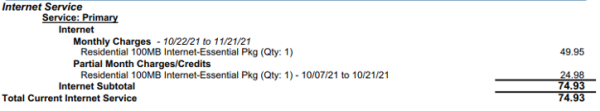 Your first month's bill will capture billing from your install date to the date of the established billing cycle as well as a month in advance. Conexon Connect has four billing cycles based on your install date (7th, 14th, 22nd and 28th) The example below shows service installed on 10/7, billed on 10/22 bill cycle. The next bill cycle will reflect the expected Monthly Charges which will include billing for service a month in advance.