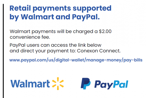Conexon Connect offers online bill payment that you can pay/manage through your MyBroadbandAccount. Forms of payment include: E-check, Automatic bank draft (ACH), VISA, MasterCard, or Discover. You also have the option of taking a payment into Walmart for a $2 convenience fee or through PayPal. Checks can also be mailed to the PO Box address listed on the payment voucher.